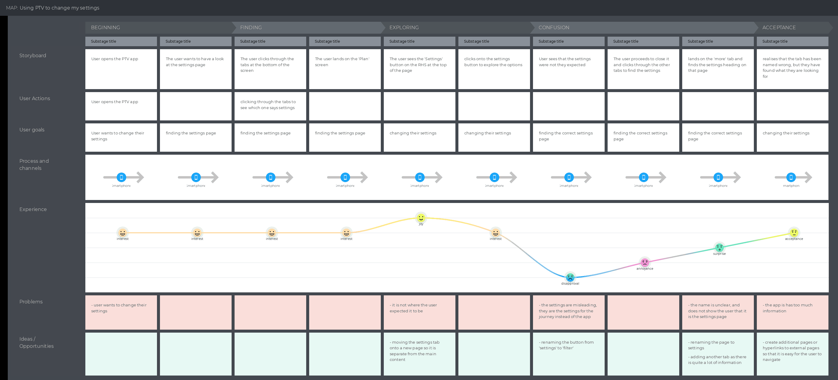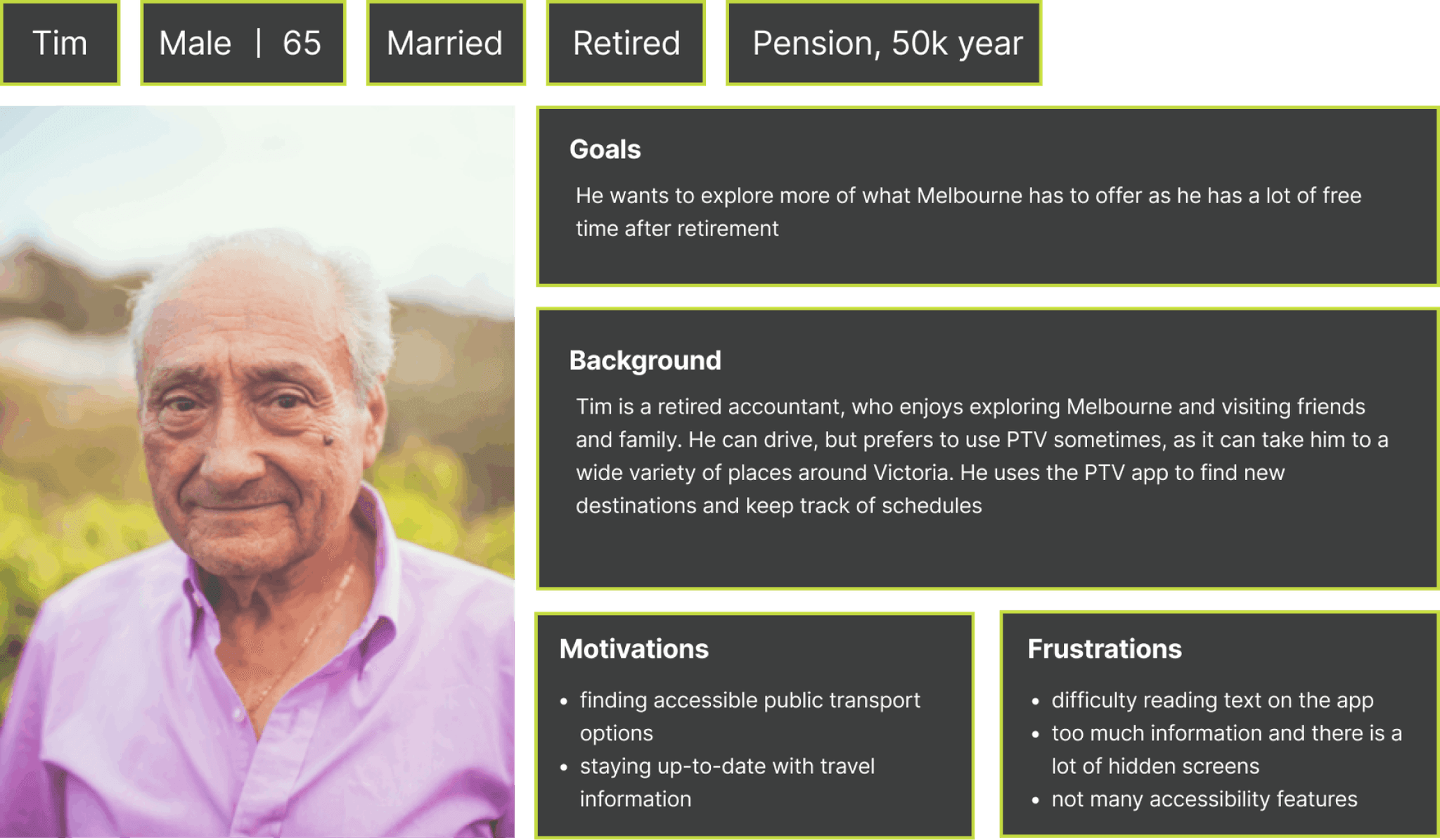 This journey map illustrates how Tim, a retired accountant, struggles to find the app settings in the PTV app.