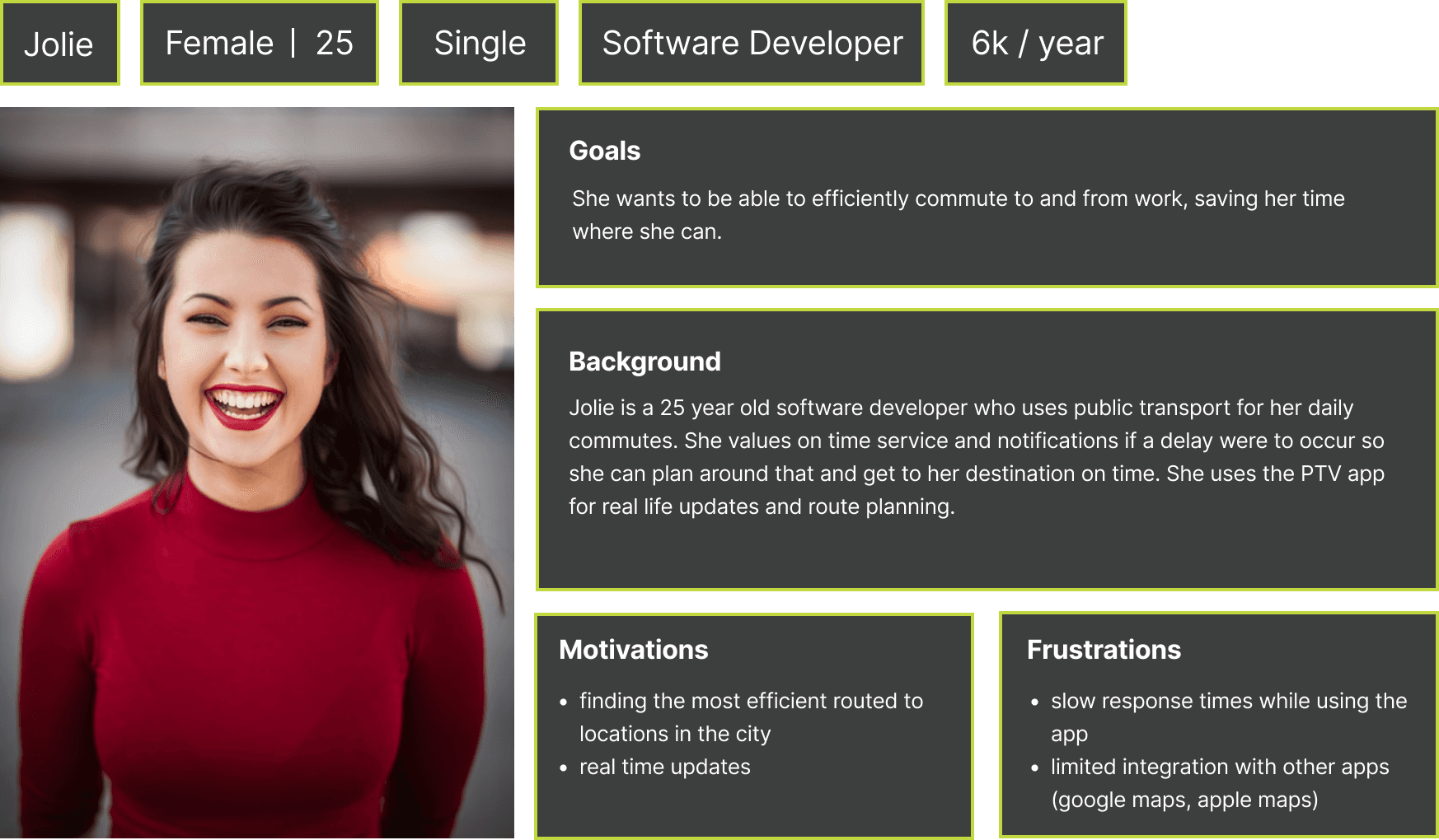 “PTV is an app that allows users to plan their travel within Victoria. It caters to a variety of users. The app can be used at any time of the day while allowing users to customise their preferred areas of interest. While it is for the whole of Victoria, it focuses on the urban, suburban and regional areas.