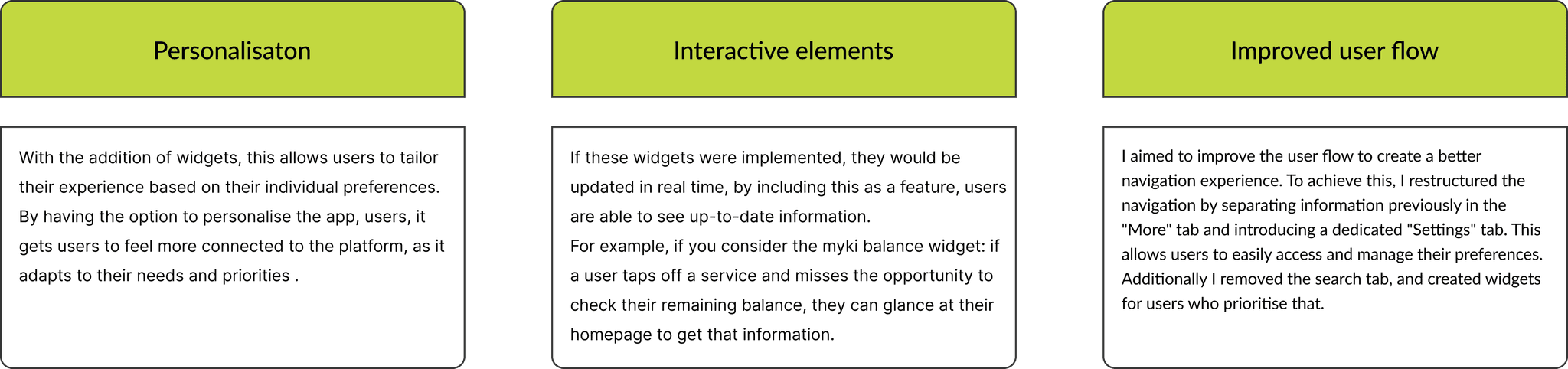 By looking at and seeking feedback from peers and friends about the existing app, I have come up with three things that make the user experience of the PTV app better than before.