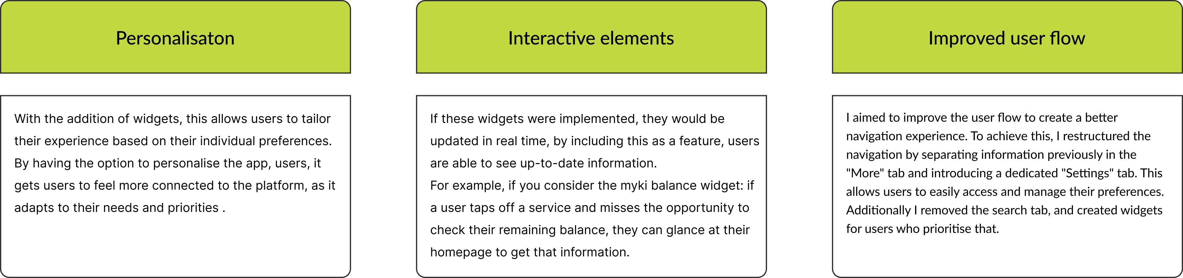 Such widgets facilitate users to prioritize and display the details they care about the most, like preferred routes, current myki balance, or myki card specifics.