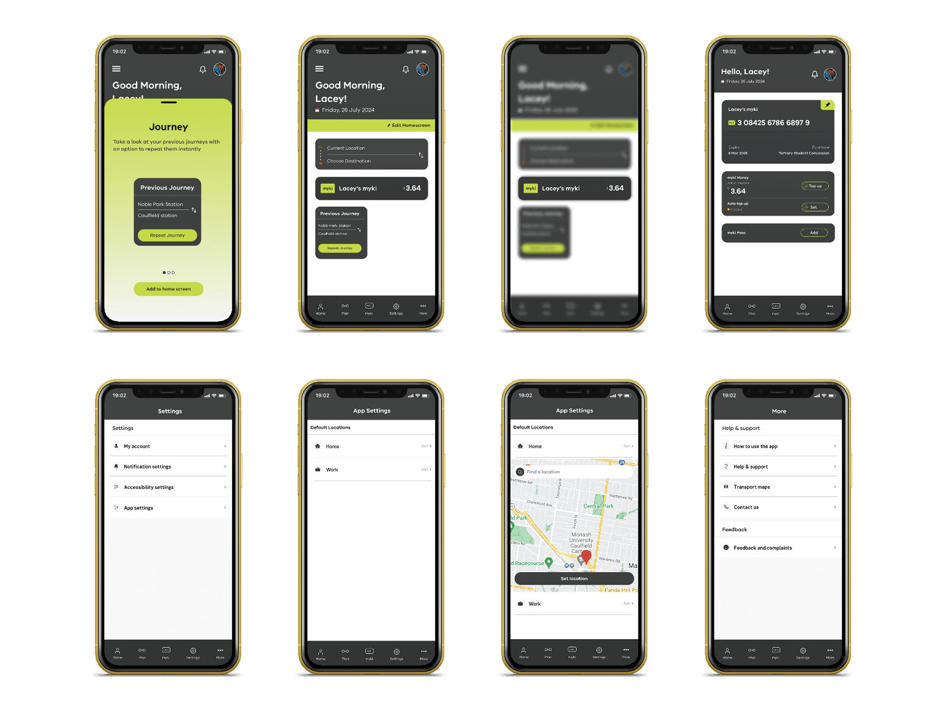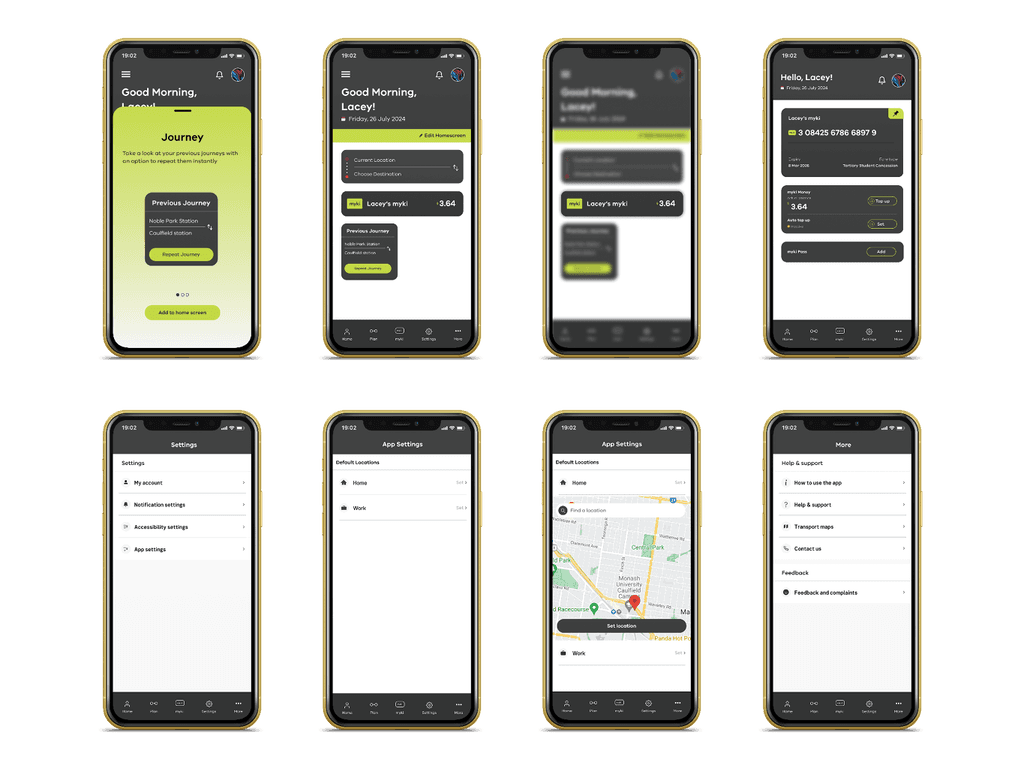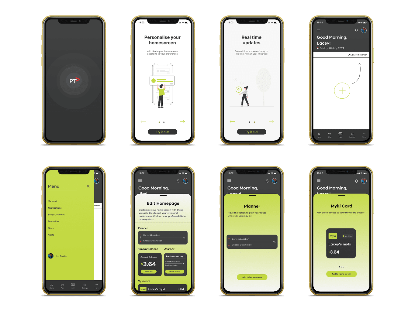 A reimagined version of the PTV app, focusing on a streamlined user experience with improved navigation, clearer button labels, and UI consistency. The redesign includes a personalisation feature, allowing users to customise their home screen with widgets that highlight the most relevant travel information.