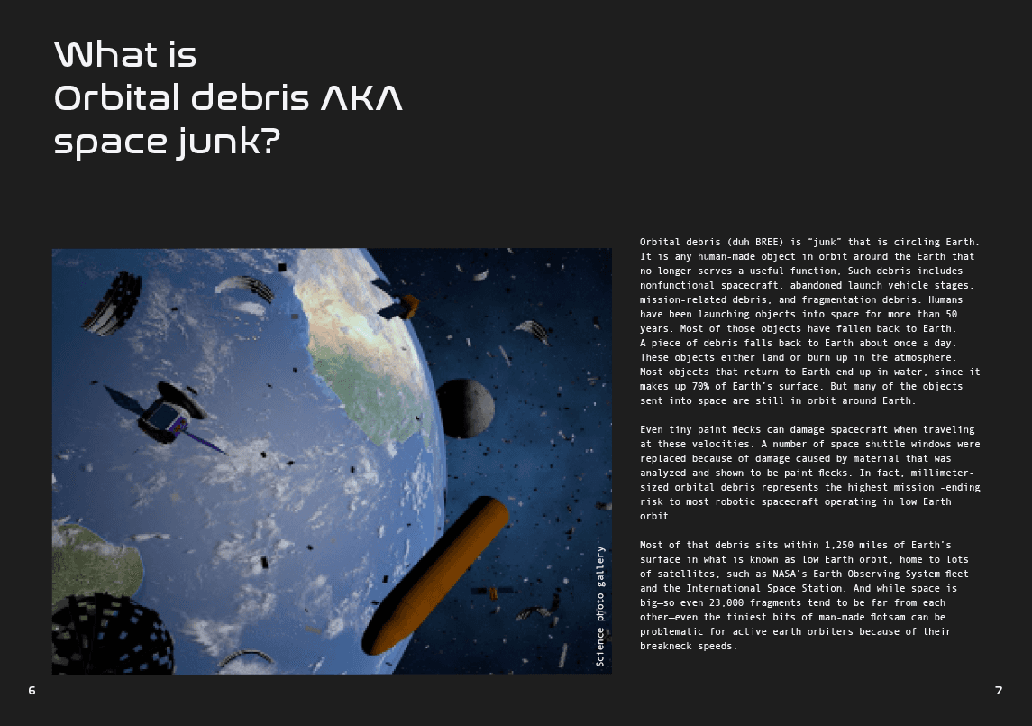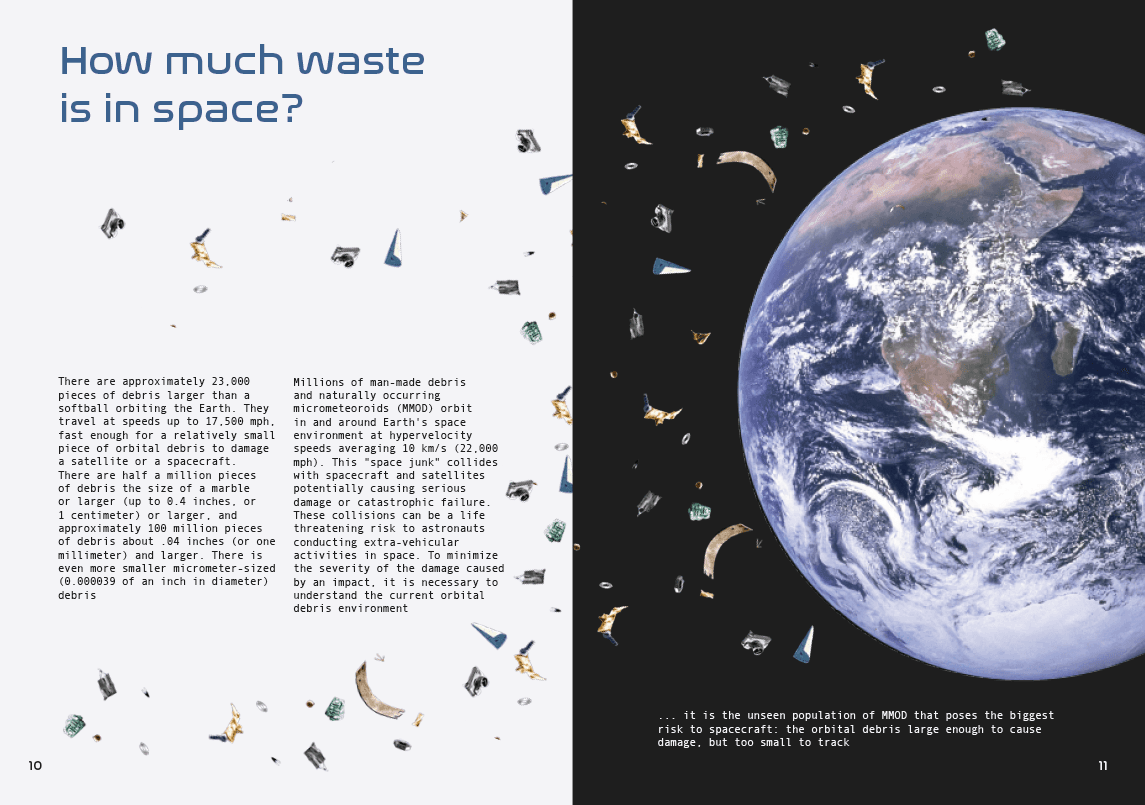 This is an informative publication on space junk (orbital debris), its impact on humanity and our environment, as well as the implications it causes in space.